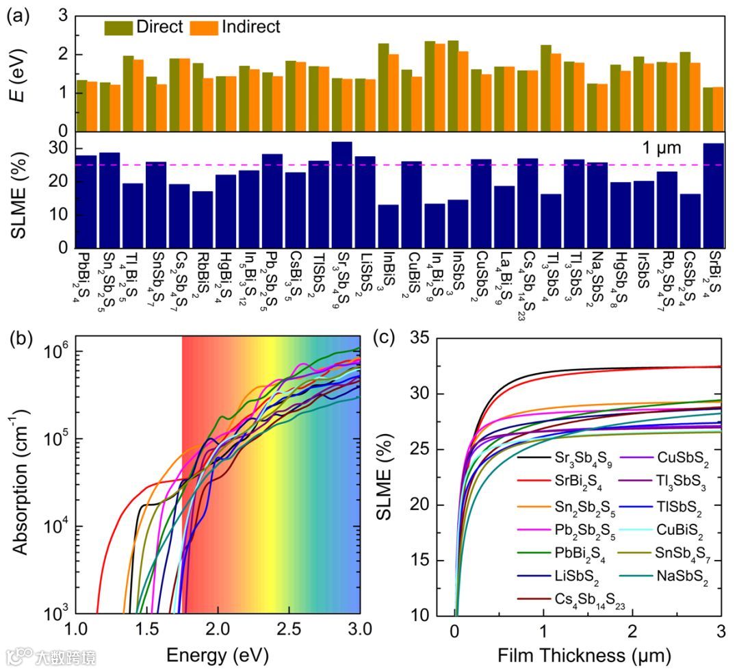 Figure 3. (a) Calculated indirect and direct band gaps and spectroscopic limited maximum efficiency (SLME) under a film thickness of 1 μm based on the improved Shockley−Queisser model of 28 compounds that have band gaps 2.3 eV> Eg > 1 eV, small electron/hole effective masses (me or mh< m0), and large dielectric constants (ε0 > 20).(b) Calculated absorption spectra and SLMEs of the 13 compounds that have SLME values larger than 25%. (c) Thickness-dependent SLME.