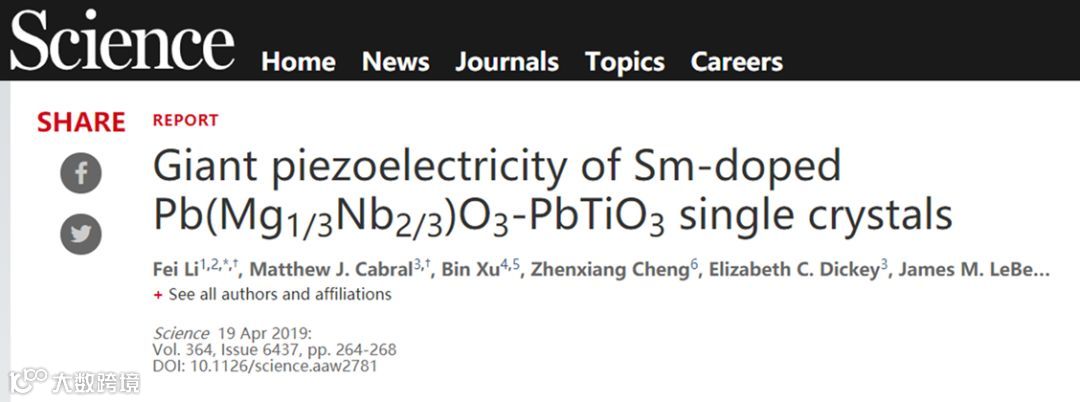 1. Fei Li , Matthew J. Cabral, ShujunZhang et al. Giant piezoelectricity of Sm-doped Pb(Mg1/3Nb2/3)O3-PbTiO3 singlecrystals. Science 2019, 364, 264-268.