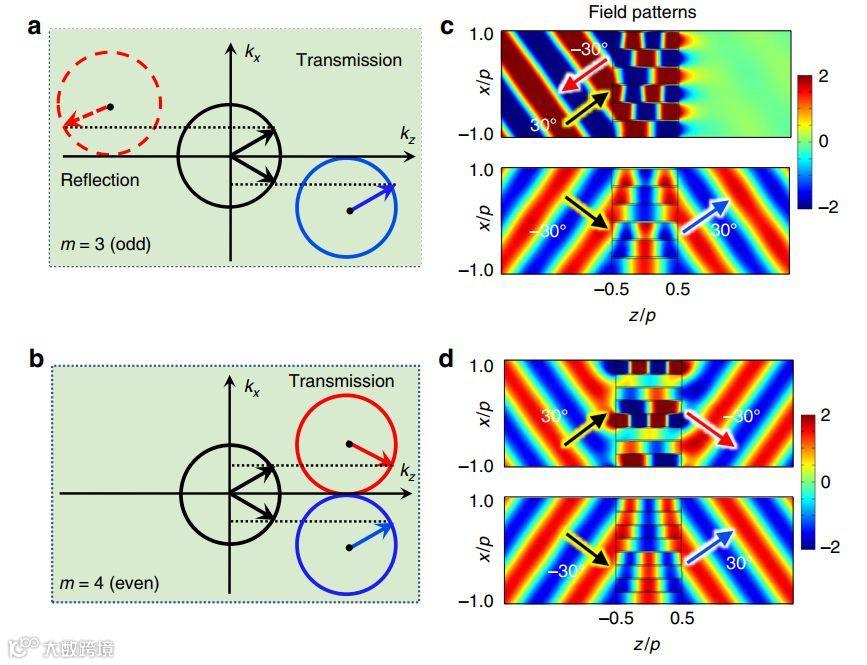 随意调控波传播的能力,吸引了大量科学家投入研究。在过去几年中,作为体块超材料的二维版本,超表面提供了新的范例,以先前不可能的方式引导波,观察到了与相应三维超材料明显不同的新物理现象。通过沿着超曲面设计相移,可以调控被散射的波前来实现反常的反射或折射,然而,最近一些研究表明,由于边界处的阻抗失配,这种相位梯度超表面(phase gradient metasurface)在波前调控的转换效率方面受到固有限制。在某些情况下,虽然可以清楚地观察到由周期性引起的更高阶衍射,但是原理机制仍然未被完全理解,尤其是在折射型超光栅中。近期,来自苏州大学和杜克大学的研究团队通过分析和实验展示了一种折射型相位梯度超光栅(phase gradient metagratings, PGMs),它可以实现异常反射和折射,并且在很宽的入射范围内几乎具有一样的效率。研究受到多次反射效应的启发,发现衍射阶数与多次反射的传播数(即波在PGM内传播的次数)和PGM的单位单元数m有关。特别地,特定衍射阶数的透射和反射振幅由传播数的整数奇偶性决定。因此,可以通过控制PGM中的单位单元的数量的奇偶性来实现对,某一阶衍射的透射和反射的调控。基于所证实的衍射机制,研究团队推导出一组新的公式,可以很好地解释所研究的PGM的复杂衍射现象,并且可以完全预测奇偶性依赖的异常反射和折射。这一衍射机制中也可以很好地解释之前工作中令人费解的衍射现象。声波的实验测量结果证实了我们的发现。此外,实验基于该原理使用锯齿形微结构设计并制作了两种折射声学超光栅,实验结果很好地验证了该理论。该工作提出的衍射机制可以成为声学/电磁PGM设计的新范例,并基于可提供的通用平台开辟新的波动操纵能力,例如非对称和广角吸收器、全向反射器等。相关研究发表在近期的《Nature Communications》杂志上。
