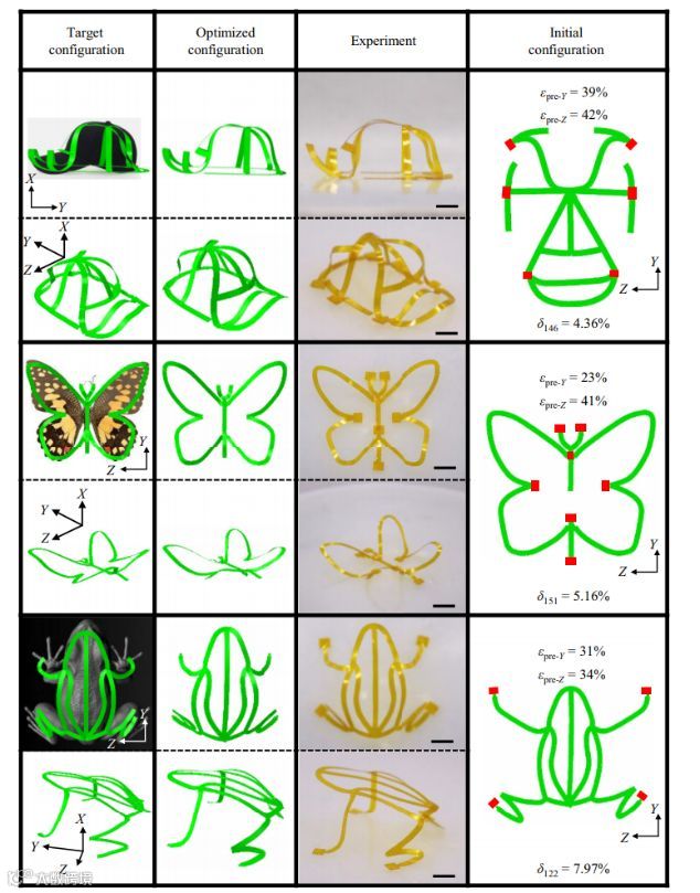 在自适应遗传算法优化的框架下,来自清华大学的Yihui Zhang提出了一种系统的计算方法来解决通过压缩屈曲组装的带状三维结构的逆向设计问题。通过对变形和初始带状结构之间固有几何关系的理论分析,建立了基于优化的逆向设计问题公式,借助有限元分析确定2D前驱体的初始几何形状。通过一组说明性示例验证所开发方法的收敛性和准确性。对大约20个带状结构的计算和实验研究,每个带状结构在目标和组装配置之间进行比较,显示了逆向设计方法的广泛适用性,展示出类似于真实物体草图(例如,尖顶帽子,蝴蝶和青蛙)的3D结构的能力表明在功能设备的精确设计中有希望的实用性。相关文章发表在杂志《Physical Review Applied》上。