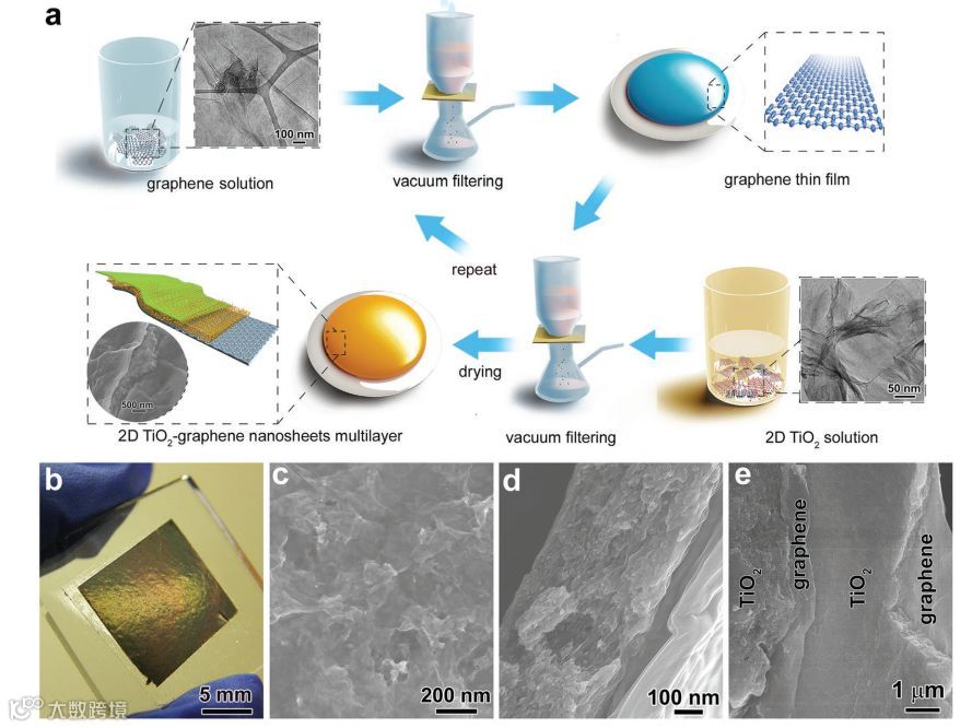 近日,澳大利亚昆士兰理工大学Ziqi Sun等人受到贝壳内部表面具有独特的光学特性启发,设计制备了一种新型的纳米光子结构材料,该纳米结构是通过一种简便的真空溅射技术制备。通过与射入水中的太阳光相互作用,这些贝壳会产生发光的团簇,用来捕食具有趋光性的生物。通过交替沉积石墨烯和二维超薄二氧化钛纳米薄片,形成二维异质结构和均质结构,这种结构无论是在色散主导的条件下还是在反射主导的条件下,均表现出显著的红绿色条纹,成功制备了参数可调控的二维纳米光子结构。该结构具有特殊的层间电荷转移特性和超快的平面内电子迁移率,同时具备非常好的光学特性以及作为光电极时显著增强的光响应行为。该研究为新型二维光子结构和器件的制备开辟了一条新的途径,也为高性能太阳能转换光电电极的设计奠定了基础。相关研究工作发表在《Advanced Functional Materials》上。