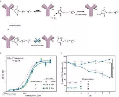 图二:超声力处理增强抗体偶联药物的稳定性。a, 含有马来酰亚胺-巯基的抗体偶联药物反应机理;b-c, ELISA表征和Western-blot表征证明经过超声处理后的抗体偶联药物具有更高的药物稳定性。