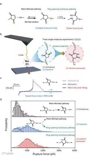 图一:马来酰亚胺-巯基的力学特性。a, 马来酰亚胺-巯基化学;b, 基于原子力显微镜单分子力谱方法研究来酰亚胺-巯基的力学特性;c, 标准力谱曲线;d, 不同反应路径下的力学特性。