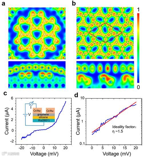 图4. 石墨烯/硅烯异质结构的电子局域函数(ELF)计算和输运特性。(a,b)硅烯纳米片和单层硅烯在硅原子平面的的电子局域函数(ELF)分布图。c)在105 K下测量的石墨烯/硅烯/钌垂直异质结构的电流-电压曲线,显示典型的肖特基型整流行为。插图是器件结构和测量的示意图。 d)伏安曲线的对数图。通过将其与Schockley模型拟合得到的理想因子为1.5。