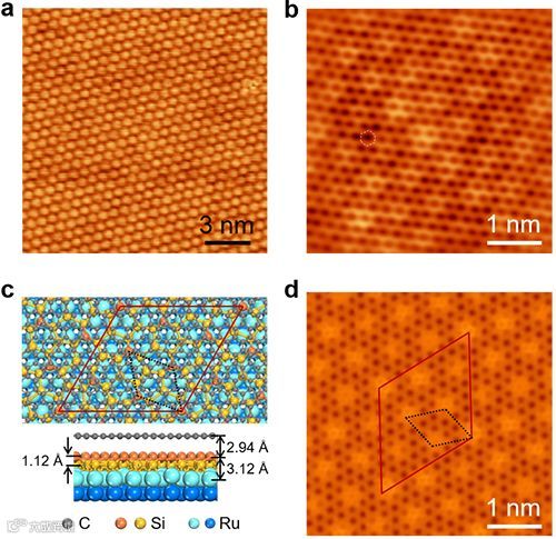 图3. 单层硅烯的STM图像及理论模拟。(a)石墨烯/硅烯异质结构生长在Ru(0001)表面的STM图像。(b)表层石墨烯晶格的原子分辨率图像。(c)(7×7)Ru(0001)/(√21×√21)硅烯/(8×8)石墨烯异质结构模型的顶视图和侧视图(超晶格元胞由红色菱形标记)。(d)(c)中构型的第一性原理模拟STM图像。