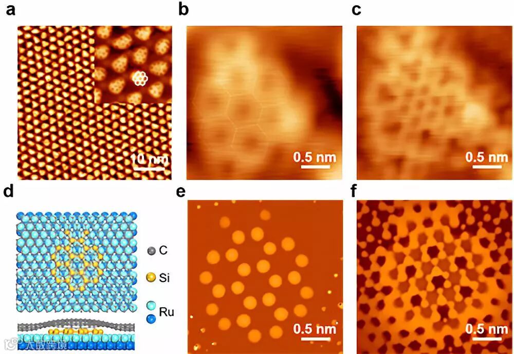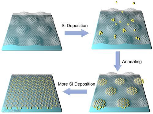 图1. 在石墨烯/Ru(0001)界面处的硅烯结构形成示意图。在退火过程中,沉积的Si原子插入到石墨烯和Ru基底之间。沉积量较小时,Si原子在石墨烯摩尔斑图atop区域(隆起的区域)下方形成蜂窝状硅烯纳米薄片。随着Si沉积量的增加,插层结构形成硅烯单层结构。