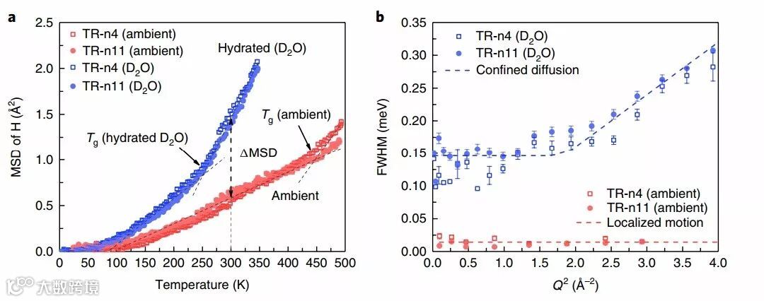a,在不同温度下, TR膜中氢原子的均方位移或振动幅度的测量值;