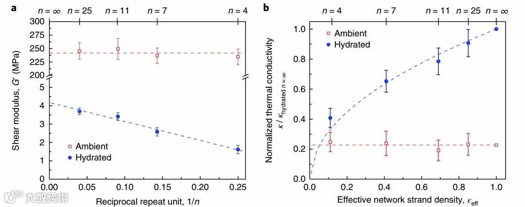 研究结果表明,对DNA序列串联重复的概念是一种对生物合成材料热传导性质进行“编程”的有效方法。他们设计并合成了一种类似于“squid ring teeth”蛋白质的具有网络拓扑结构的高分子材料,其导热性在不同的湿度下表现出极大的差异:当大气湿度低于35%时,这些蛋白质的热导率与普通的高分子无序材料差不多,表现出热导率较低的“关闭”状态;而当湿度较大、发生水合作用以后,高分子材料内部的无定形链构象和整体网络形态都会发生显著的变化,其热导率较高、体现出“开启”状态。并且,他们还发现随着串联重复序列数n的增加,热导率也逐渐增大。