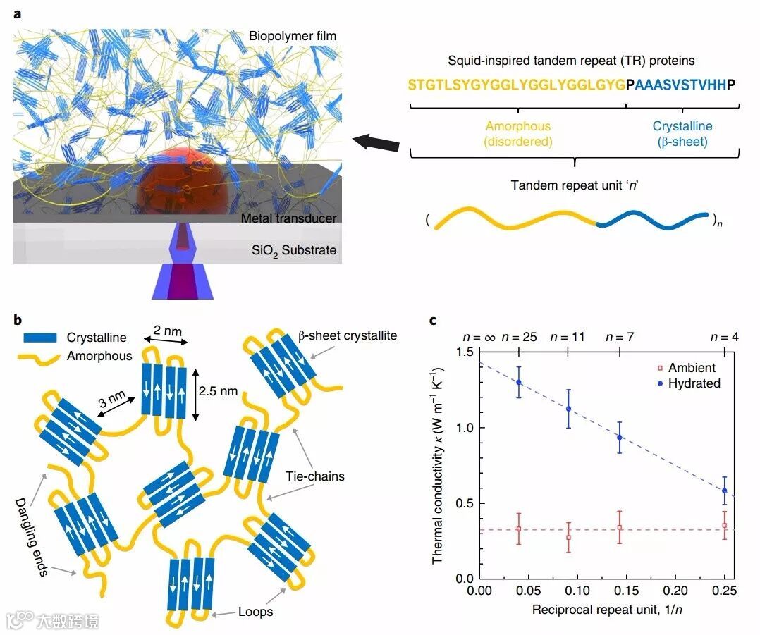b,TR蛋白的二维卡通图,由结晶相(蓝色)和非晶相(黄色)链组成;