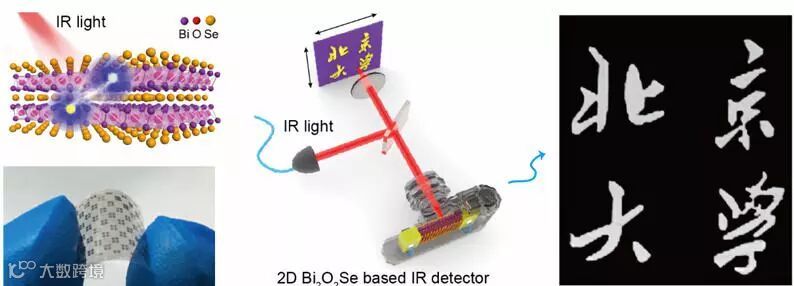 超快高敏二维Bi2O2Se红外探测器芯片材料示意图及其近红外成像展示