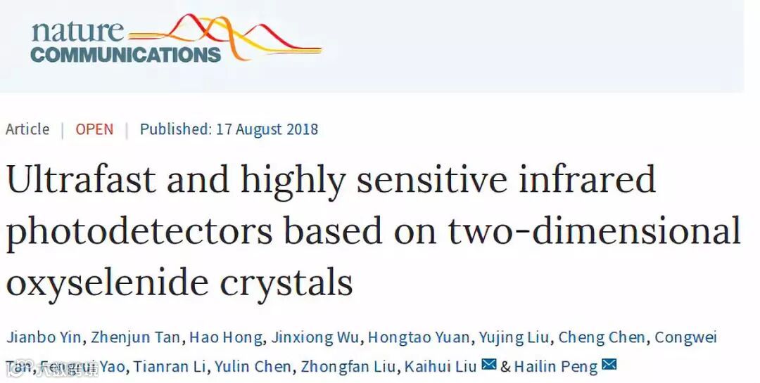 该研究成果以“ultrafast and highly sensitive infrared photodetectors based on two-dimensional oxyselenide crystals”为题发表于2018年8月17日的《自然-通讯》Nature Communications(DOI: 10.1038/s41467-018-05874-2)上。彭海琳教授和刘开辉研究员为该工作的共同通讯作者。文章的并列作者为尹建波博士、谈振军、洪浩及吴金雄博士。该工作得到了来自科技部和国家自然科学基金委等项目的资助。