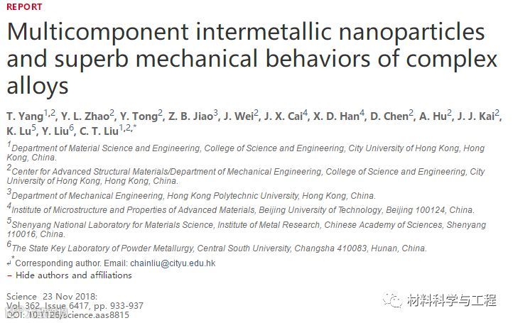 近日,由国际著名材料科学家香港城市大学刘锦川院士领衔的学术团队与香港理工大学、北京工业大学、中国科学院金属研究所和中南大学合作,报道了一种新型高强度高塑性的超合金。相关成果以题为“Multicomponent intermetallic nanoparticles and superb mechanical behaviors of complex alloys”发表在《Science》上。