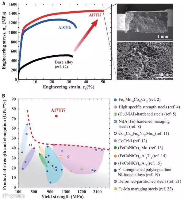 刘锦川团队以塑性无序多组分基体FCC型Fe-Co-Ni和塑性有序的多组分Ti-Al金属间化合物纳米颗粒进行复合,实现了强度与塑性的平衡。基于这一原理,研究团队设计了一系列超合金,其中 (FeCoNi)86-Al7Ti7 (Al7Ti7) 合金室温拉伸断裂强度超过1500MPa,延伸率仍高达50%。这项研究为高强度和高塑性的高熵合金的设计和发展,提供了新策略和新思路。