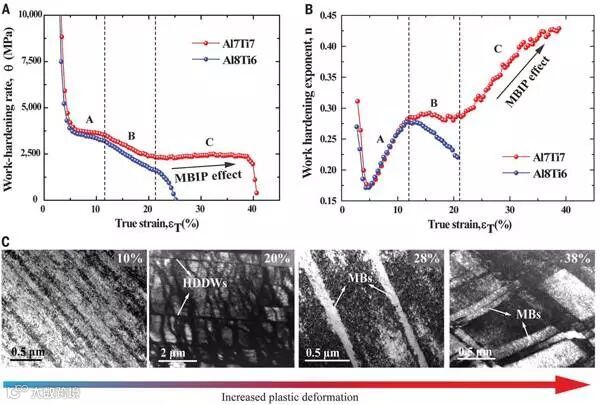 图4 MCINPS合金在常温下的加工硬化行为和微观机制