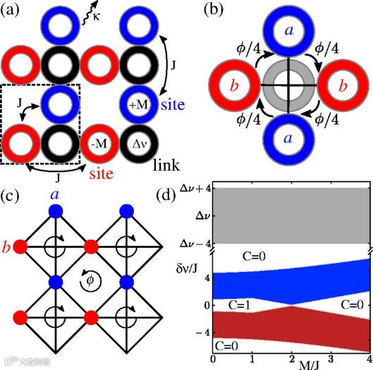 现如今,单个芯片的时钟频率已经逼近极限、难以有很大程度的提高,芯片的发热问题也是日益严重,最主要的原因是电子在导线中的传播受到强烈的散射和阻碍作用。因此,理论上损耗更小的“光子芯片”成为科学家努力的方向。然而,一旦光波导中存在杂质或缺陷,用于通信的光波还是会发生散射、产生严重的光功率衰减。近年来,拓扑光子学(topological photonics)的出现,使得界面或边界处的光信号传输可以不受到缺陷、杂质的影响,具有鲁棒的“缺陷免疫”特性。近日,来自韩国国家基础科学研究院、美国马里兰大学、新加坡南洋理工大学的科研团队提出了一个可重构的拓扑光子系统(reconfigurable topological photonic system),它是由耦合环谐振器的2D晶格组成,两个子格位的环形腔通过链环耦合,可以采用紧束缚模型(tight-binding model)精确描述。与以往的耦合环拓扑模型不同,这里的设计类似于Haldane模型是平移不变的(translationally invariant),而非平庸的拓扑是源于非零交错相位(nonzero staggered phase)的次近邻耦合(next-nearest coupling)。当子晶格对应的频率失谐时,该系统表现出平庸相和自旋Chern绝缘体相之间的拓扑相变(topological phase transition),这种拓扑相变可以通过热、电光调制器或非线性交叉相位调制来实现。这里所设计的可重构拓扑波导在片上光子路由器和光开关等方面具有潜在的应用。相关结果发表在近期的《Physical Review Letters》上。