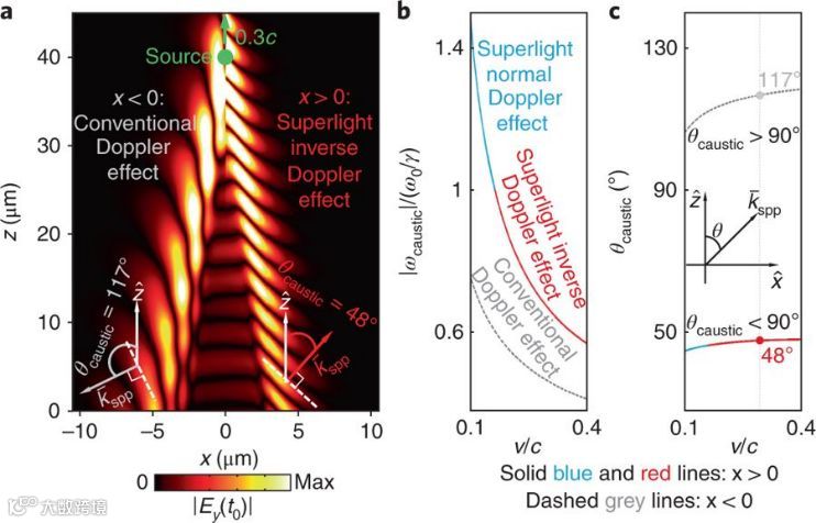 多普勒效应(Doppler effect)作为一种众所周知的因运动引起的频移现象,是物理学中最基本的机制之一,在激光测振、卫星全球定位系统、胎儿血流测量等领域具有广泛的应用。对于传统的多普勒频移,在光源接近(远离)物体的运动过程中,物体接收到的频率比发射频率更高(更低);而逆多普勒效应(inverse Doppler effect)正好相反,其多普勒频移的符号与传统现象相反,从直观上来说这在具有正折射率的均匀系统中是不可能实现的,它要求介质的折射率必须为负!最近,来自新加坡南洋理工大学的张柏乐(Baile Zhang)课题组和以色列理工学院的Ido Kaminer和麻省理工的Marin Soljačić教授与John D. Joannopoulos教授,打破了这一长久以来的固有观念,预测出在特定情况下,Vavilov-Cherenkov辐射锥体内存在之前尚未考虑的反常多普勒效应。从Ginzburg和Frank的经典工作中可以知道,如果光源的速度v大于其相位速度vp,那么在Vavilov-Cherenkov锥内就存在超光速(superluminal)的正常多普勒效应。进一步发展他们的理论,研究人员发现如果v> 2vp,将产生逆多普勒频移(inverse Doppler frequency shift),他们将其称为“超级光”(superlight)的逆多普勒效应。此外,理论研究预测:通过使用高度压缩的“极化子”(如石墨烯的等离激元),逆多普勒效应可以在空间上与其他多普勒效应分离,这可以促进实验观测工作的顺利推进。相关工作发表在近期的《Nature Physics》上。