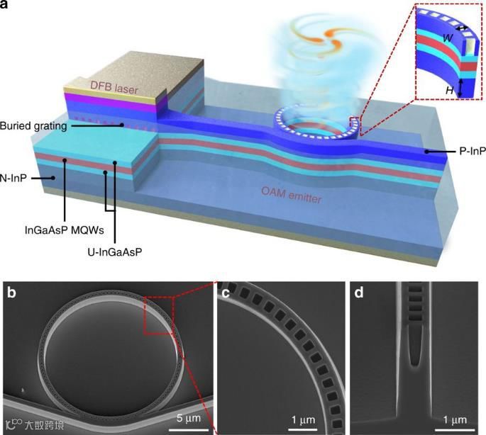 涡旋光(vortex beam)是一种携带轨道角动量(Orbital Angular Momentum, OAM)、具有螺旋型波前特征的光学光束,波束的相位随方位角φ而变化,其电场分量表示为E~exp(jlφ),其中l是OAM态的拓扑荷数(topological charge)。在实际应用中,OAM光可以为波分复用器件中的信息编码提供额外的自由度,适用于纳米粒子操作、光学成像和显微镜、光纤和量子通信的应用。近日,来自清华大学的罗毅教授课题组、日本东京大学的Yoshiaki Nakano教授以及中山大学的蔡鑫伦教授和余思远教授,通过在同一个InGaAsP / InP外延晶片上光学涡旋发射器与分布式反馈激光器(distributed feedback laser)的单片集成,制造出了在通信波段下工作的电泵浦集成OAM发射器。研究人员采用单步干蚀刻工艺,完成了OAM发射器制备,并配备专门设计的顶部光栅。在实验上,他们捕获了由集成器件发射出的涡旋光束,并系统表征了OAM模式的纯度。在这里,集成的OAM发射器消除了基于硅或硅绝缘体的传统OAM发射器所需的外部激光器,因此在通信系统和量子领域中具有巨大的应用潜力。相关研究发表在近期的《Nature Communications》上。