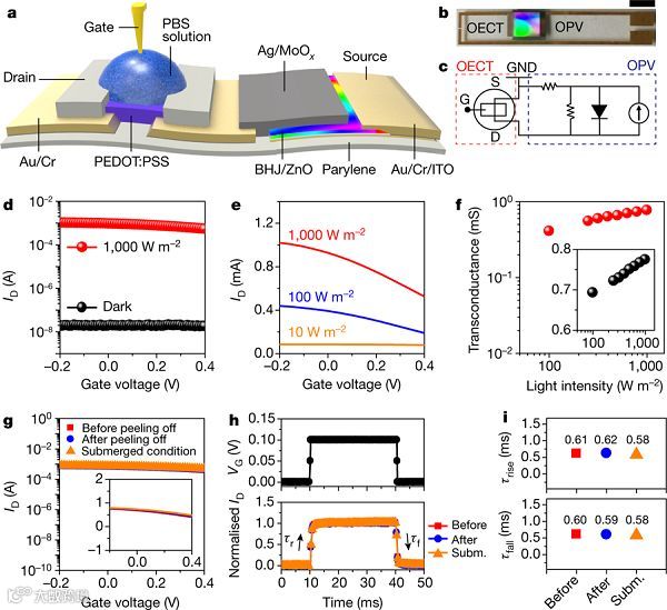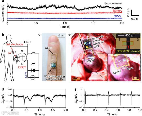 日本应急物质科学中心(CEMS)的Kenjiro Fukuda,Keisuke Tajima教授以及东京大学的Takao Someya教授(共同通讯)联合在Nature上发表文章,题为:Self-powered ultra-flexible electronics via nano-grating-patterned organic photovoltaics。在这里,作者实现了自供电超柔性电子器件的制备。当应用于皮肤或其他组织时,该器件能够以非常高的信噪比测量生物信号。作者将用作传感器的有机电化学晶体管与有机光伏电源集成在一微米厚的超柔性衬底上。使用高通量室温模塑工艺在电荷传输层上形成纳米光栅形态(周期为760nm)。这大大提高了有机光电转换器的效率,提供了高达10.5 %的高转换效率,并实现了每克11.46瓦的高功率重量值。有机电化学晶体管在生理条件下表现出0.8毫西门子的跨导和超过1千赫兹的快速响应,这导致心脏信号检测的最大信噪比为40.02分贝。作者的发现为下一代自供电电子产品提供了一个通用平台。