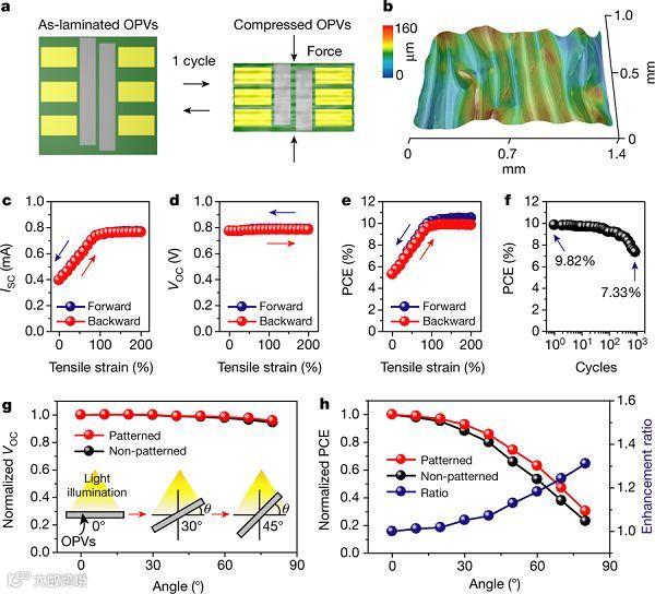 图2 :双光栅图案超柔性OPV的机械耐久性