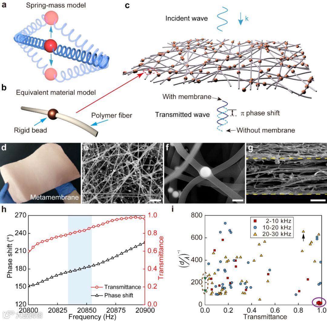 i) 实验测试的声学薄膜不同厚度,透射率,出现180度相位变化的频率范围之间的关系图。
