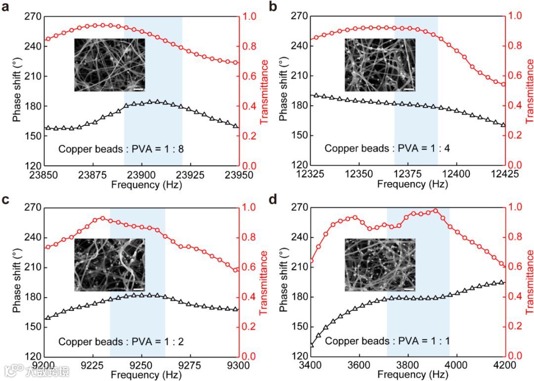 a-d) 不同质量比声学薄膜的透射率和透射相位数据,以及相应的薄膜SEM图像。从a到d,颗粒/聚合物质量比分别为1:8, 1:4, 1:2, 1:1。