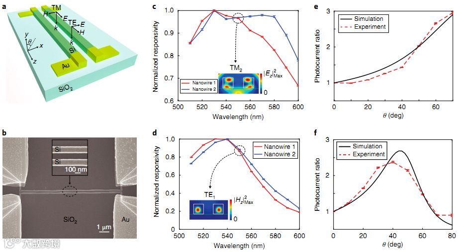 e,纳米线中光电流比的角度依赖性,在波长550nm下测量,具有与c相同的偏振;