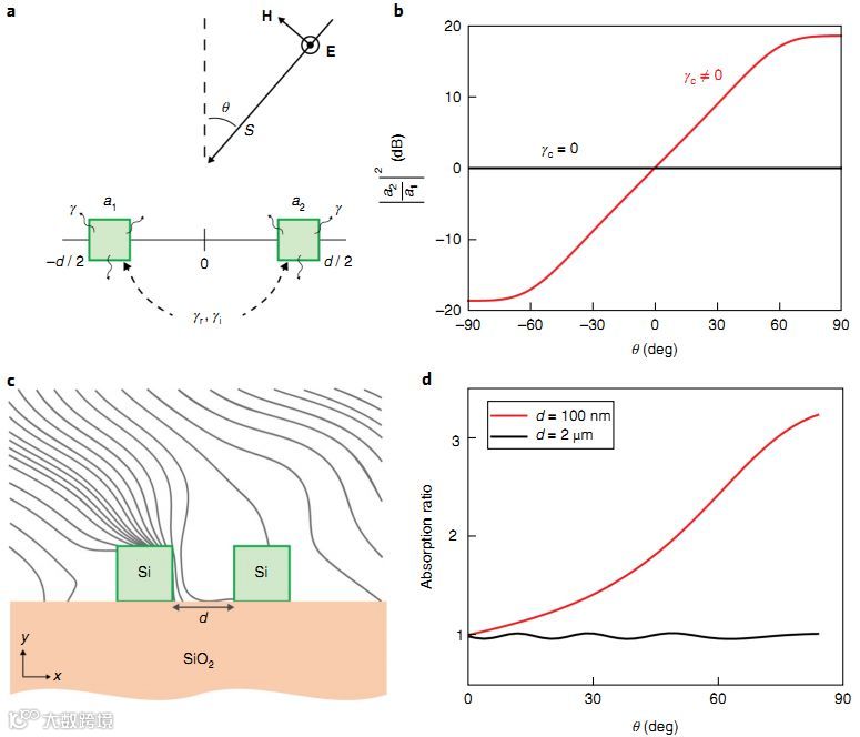 d,作为入射角的函数,d = 100nm和d =2μm的两个Si纳米线之间的吸收率。