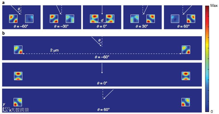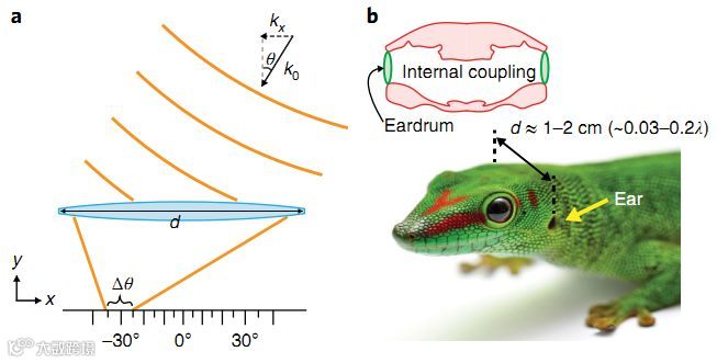 如果声音不是直接从壁虎的顶部发出,那么鼓膜本质上会窃取一些声波能量,否则这些能量将通过隧道传递到另一个鼓膜。研究人员设计了一个亚波长光电探测器,可以测量光的强度和入射角。光电探测器依赖于两个支持光学Mie谐振、紧密间隔的Si纳米线的电隔离和光学耦合。当这些谐振器将光散射到相同的自由空间光学模式,非厄米特耦合导致了高灵敏度的角度测定。通过简单的光电流测量,可以量化每个纳米线中存储的光能,并将导线之间储存能量的差异与光波入射角联系起来,可以绘制入射光波的角度。利用这种效应制造的亚波长角度敏感像素角度灵敏度为δθ= 0.32°。