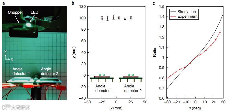 a,安装在两个独立芯片上的角度探测器, LED光源嵌入在半球形玻璃透镜;