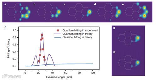 实验中首先根据理论预测的量子动态演化过程中最大的到达概率以及对应的最优演化长度,通过飞秒激光直写技术制备最优演化长度附近的若干组芯片样品。然后通过激光注入、CCD成像观测芯片输出的光强概率分布,确定不同层数结构的最优演化长度。注入单光子量子光源,用高精度单光子成像观测在最优“快速到达”情形下的演化图形。图二展示了量子算法可实现约90%的最优到达效率,最优演化长度约为25mm。而经典算法只能缓慢地达到最优演化情形,且最优到达效率只有6.25%,比量子行走小了一个多数量级。这是经典随机行走的扩散传输本质导致的,出口节点达到的最优到达效率相当于1除以所有节点的数目。量子行走在复杂分叉结构时可以选择左和右的叠加态,从而在最优到达效率和最优演化长度都实现明显的优势。
