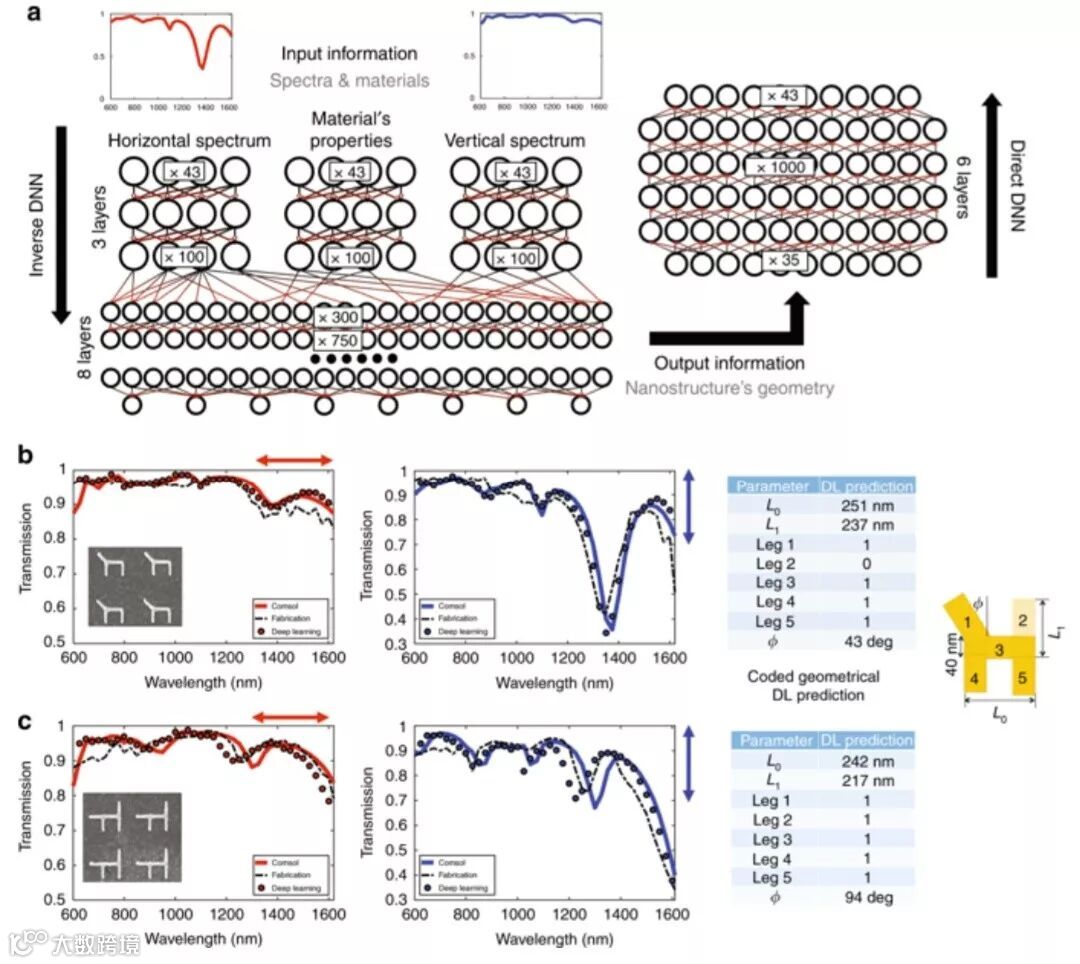 纳米光子学(Nanophotonics)是融合光子学和纳米技术的交叉前沿领域,近年来科学家们通过控制光波与亚波长结构的相互作用,推动了光学研究的飞速发展。然而,尽管该领域取得了许多进展,但纳米光子学功能材料的设计、制造和表征仍然普遍是一个漫长的迭代过程,设计人员需要根据经验和基本原理“猜测”出一个特定的结构,并通过求解相应的麦克斯韦方程对结构进行不断的修正和优化。更重要的是其“逆向工程设计”,即为了获得所需电磁响应的纳米光子学器件,人们往往需要在非常有限的假设框架内、通过耗时且极具挑战性的逆向设计才能够实现既定目标。最近,来自以色列特拉维夫大学的Haim Suchowski教授课题组通过实验证明:经过数千次实验训练的新型深度神经网络(Deep Neural Network),不仅能够从远场测量结果中提取亚波长尺寸结构的信息,而且还能够直接解决逆向工程问题。这里的方法允许快速地设计和表征基于超表面(Metasurface)的纳米光子学元器件,并且针对目标化学成分和生物分子的检测设计出最优化的纳米结构,这对于传感、成像和集成光谱等方面的应用至关重要。相关研究发表在近期的《Light: Science& Applications》上。