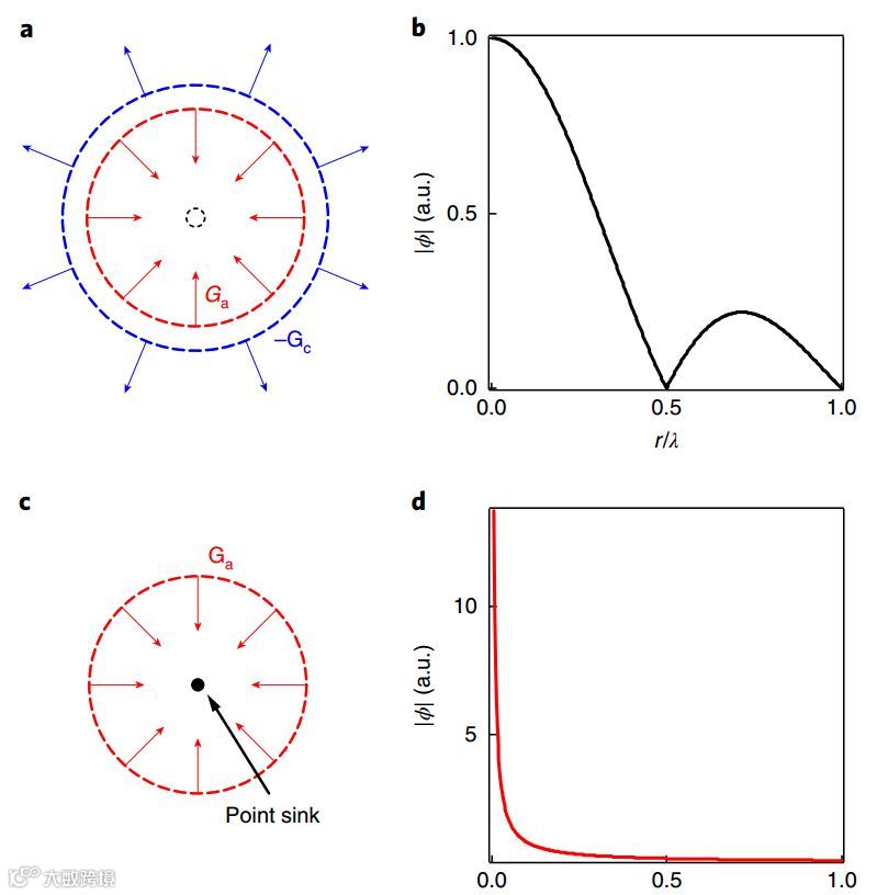 如果能够将向外扩散的球面波(蓝色)除去会怎样?我们可以考虑一个向外辐射声波的点源,点源产生的声场强度与距点源的距离成反比,并且在点源处的声场强度是无穷大的,强度峰的半峰宽可以看成是无穷小。点源辐射出的是一个扩散的球面波,如果将这个过程时间反演(time-reversal)一下,如图1c所示,即球面波向内会聚,同时在中心点的位置被全部吸收掉,因为时间反演并不会改变声场的分布,这样就可以实现远小于波长尺度的声聚焦(图1d)。