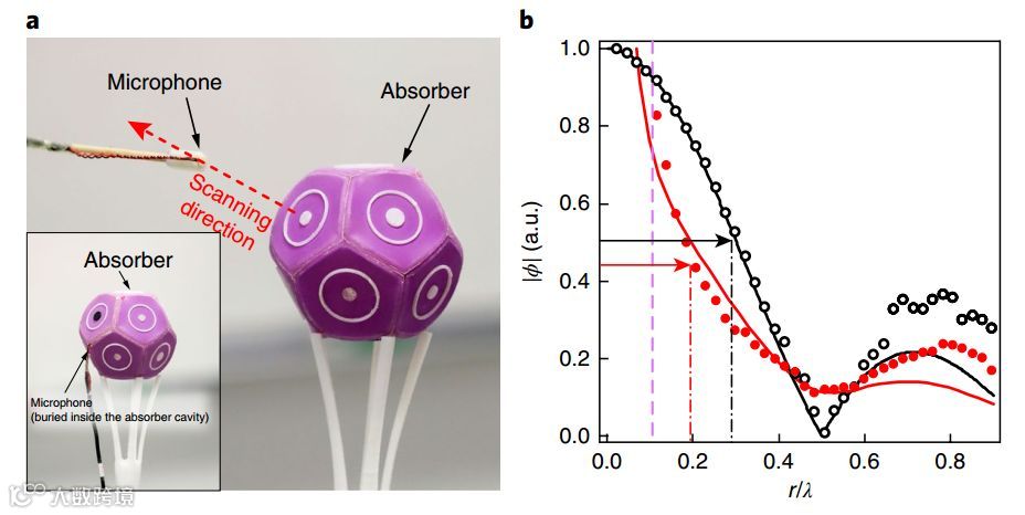 实验结果也很好验证了亚波长聚焦的效果:在中心点处放置吸声体后,声场能够实现一个更小尺度的声场聚焦。当然由于吸声体的尺寸原因,以及不能够实现百分之百的完美吸声,中心点处声场强度的半峰宽实验测量值为0.4个波长,比衍射极限值低了20%(图3)。如果能够进一步减小吸声体的尺寸以及优化吸声性能,聚焦的效果还可以进一步提升。
