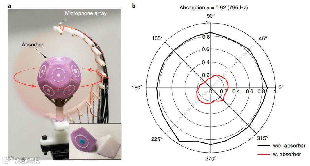 图3 a.实验测量示意图 b. 红点为放置了吸声体后的测量到的声场分布,黑色圆圈为没有吸声结构的测量值