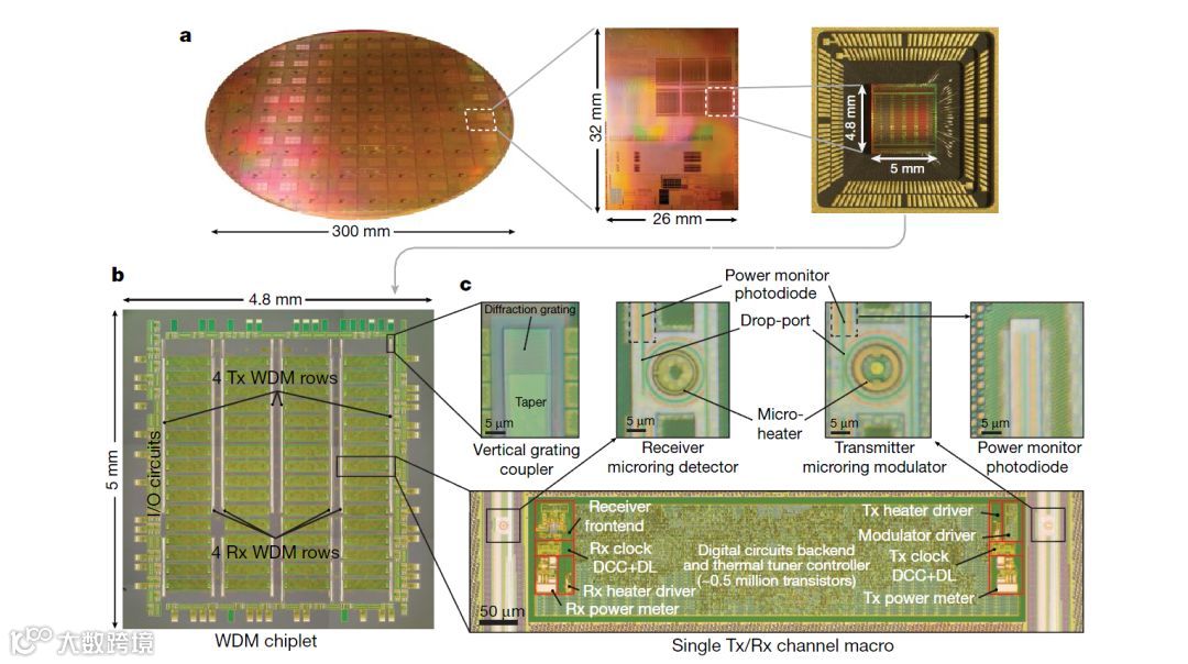 图2. 65nmCMOS工艺下的单片电光子集成平台。a.300mm晶元整体照片、掩膜版特写、封装的WDM芯片。b.具有四个WDM芯片的发射器和接收器序列。c.单个光收发器及其光子和电子电路元件特写。