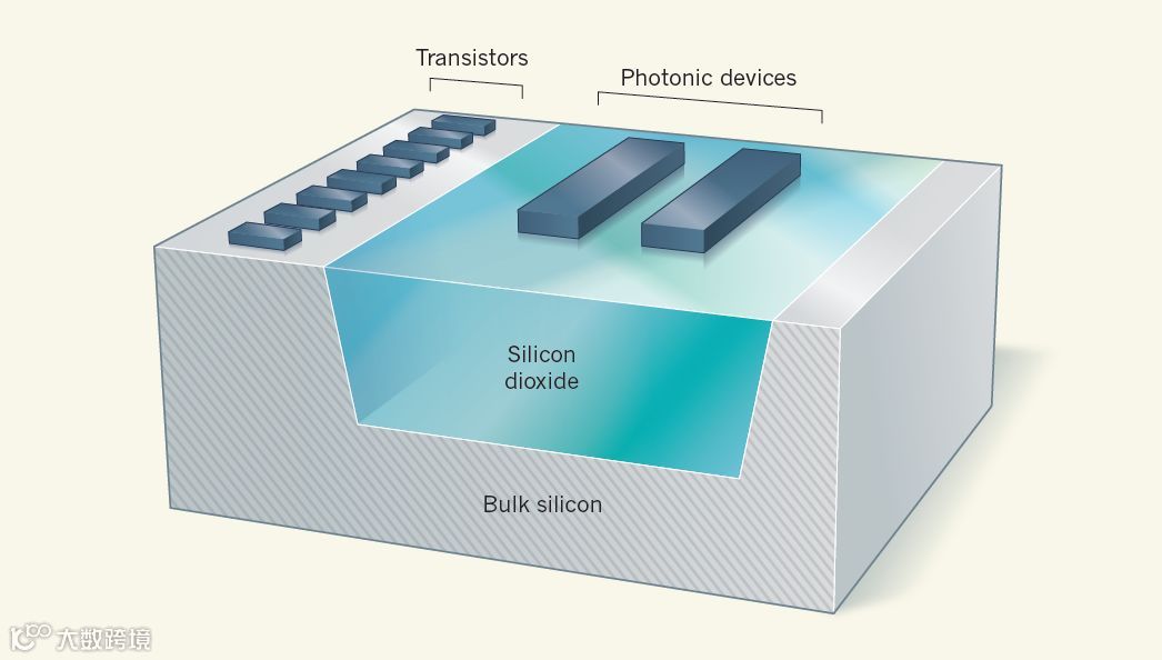 电子器件基于CMOS技术,其材料平台为体块硅衬底或薄SOI晶元。其中体块硅衬底是最主要的平台,其成本低廉,供应链丰富,能够满足大规模生产要求。与此相对,硅光子器件材料平台为厚SOI晶元,硅与二氧化硅能够提供光波导所需的折射率差异。但是厚SOI晶元成本相对昂贵,供应链有限。
