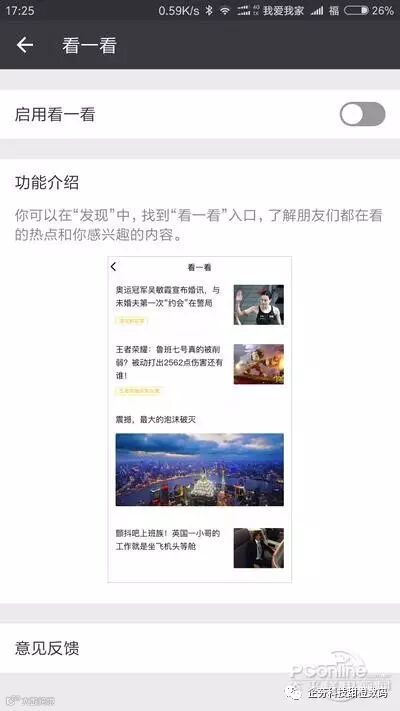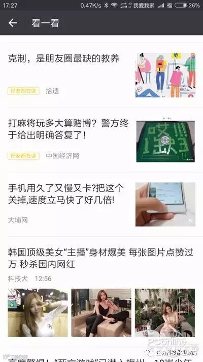 “看一看”功能就是让用户可以查看到微信好友在看的热点内容及一些推荐的资讯内容。相关内容有标识来源,除来自好友都在读外,还有其他网站内容推荐。