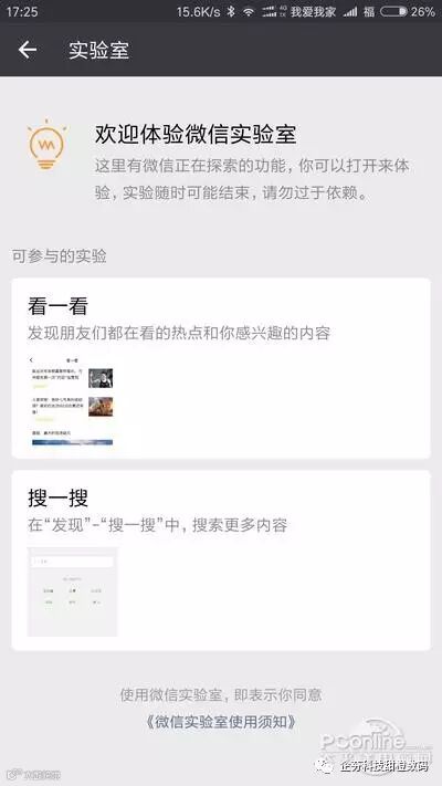 微信新版最引人瞩目的功能就是“实验室”的推出。微信实验室是微信推出的一个新功能,用来尝试一些探索性的新功能,让有需要的用户可以主动参与或自由退出体验,这里的实验性功能结束实验后,可能成为正式功能,也可能被下线。也就是说微信今后推出的新功能都可能放在“实验室”里,先让喜欢尝鲜的用户试用了以后再决定是否上线。