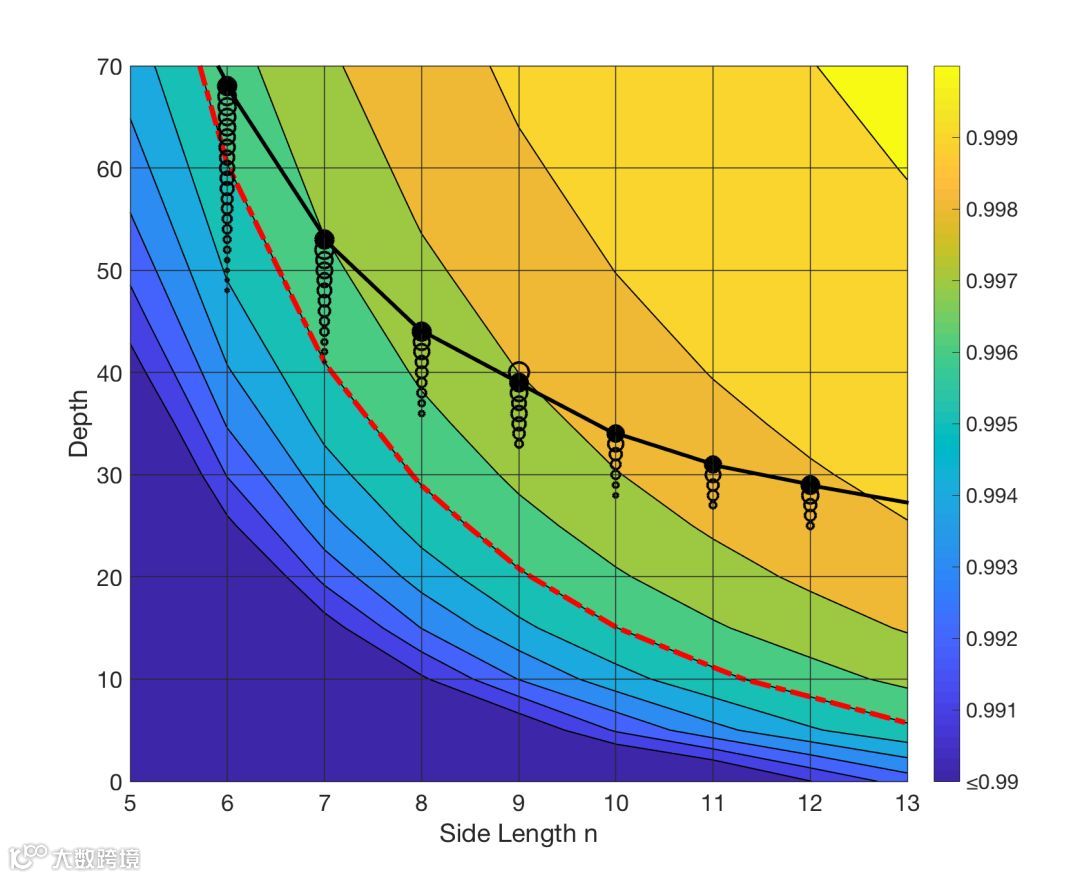 图丨“太章”模拟的随机量子电路规模(黑线)与谷歌量子硬件可以实现的规模(红线) 比较(基于谷歌在[Characterizing quantum supremacy in near-term devices]中对7x7的估计)*