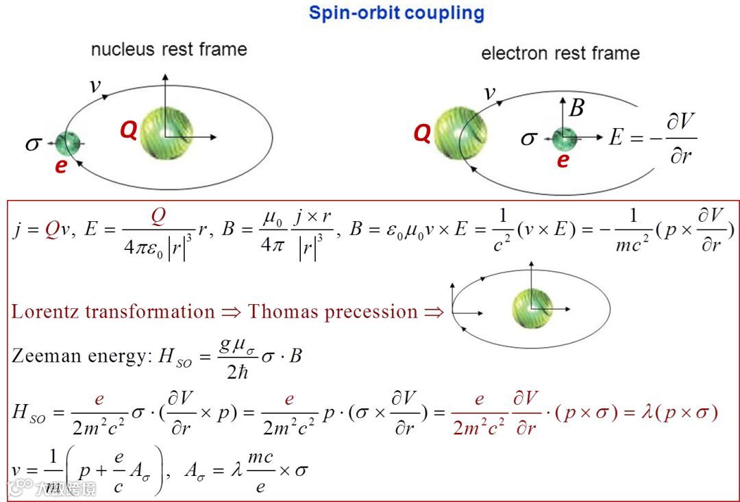 图5. 自旋-轨道耦合的半经典图像,其中考虑了相对论性修正。p 为电子电荷动量、σ为自旋算符、V 为静电势。