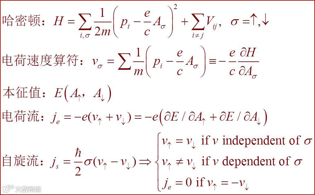 图4. 电子电荷流与自旋流。i 为电荷标记、m 为电子质量、p 为动量、A 为电磁场矢势、σ为自旋符号、V 为相互作用势、v 为电荷流动速度、E 为自旋分辨的本征值。