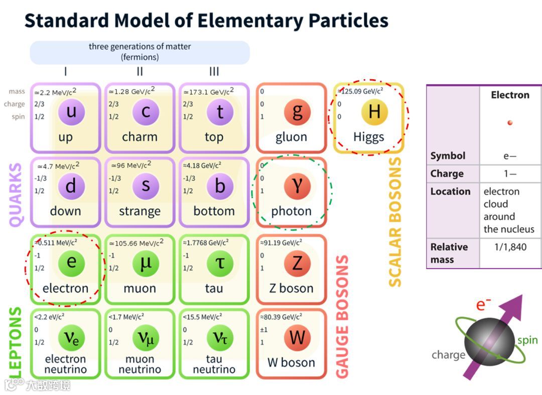 图1. 标准模型下基本粒子排列,它们组成了我们的物质和意识,是我们的祖先!其中电子、光子和Higgs 三种粒子用虚线圆标记出来,它们是与我们的生活如影随形的粒子。其中电子的属性单列于右侧。