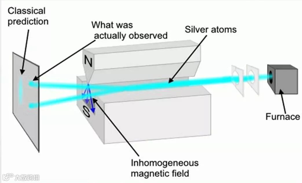 图2. Stern–Gerlach 实验。银原子细束在经过不均匀的磁场区域,分成了两束最后到达照相底片上,显像后的底片上出现了两条黑斑。