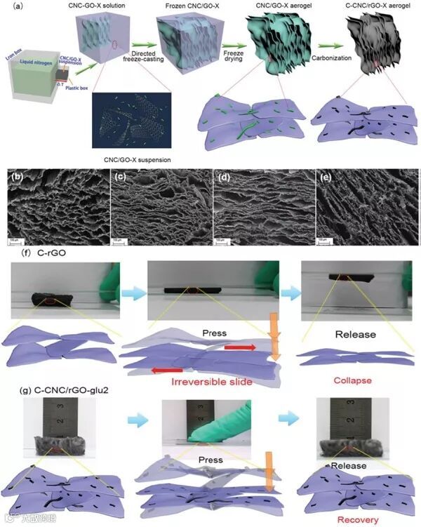 (a)C-CNC/rGO-X 碳气凝胶导向冷冻铸造示意图,其中X代表葡萄糖(glucose)和尿素(urea);