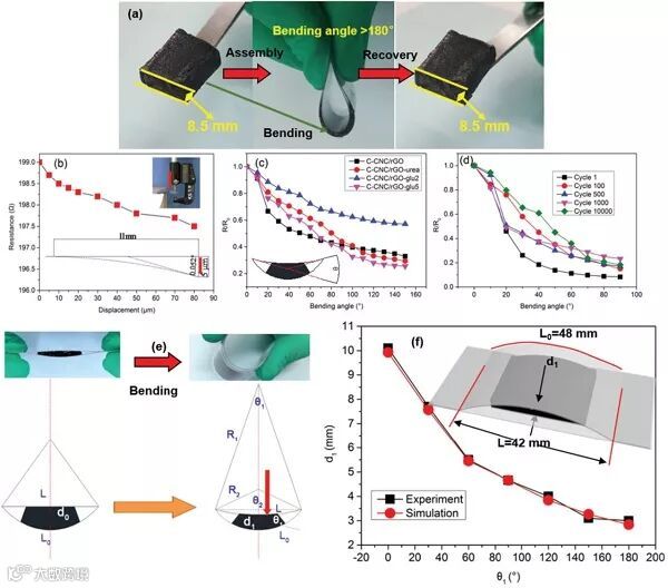 (a)C-CNC/rGO-glu2弯曲前后的数码照片;
