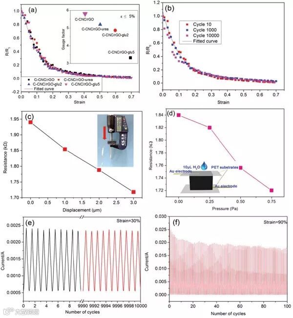 (a)10次循环后的归一化电阻R/R0,内置图为压缩应变ε ≤ 5%时的应变灵敏系数;