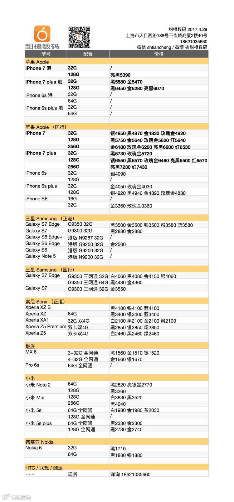 多款 iPhone 7 及 plus 国行版机型小幅走低 20 元,港版机型基本没有变化;小米部分机型也有 20 元降价;索尼、三星今日稳定。