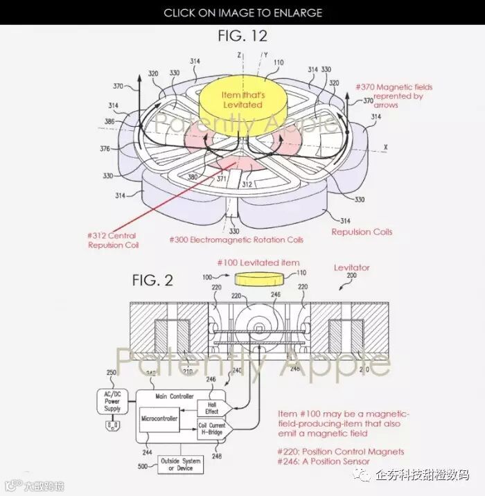 苹果提到悬浮器可以为像iPhone、Apple Watch等这样的设备无线充电。充电时,设备可以悬浮或者置于像图1中描述的那样一个悬浮系统之中。