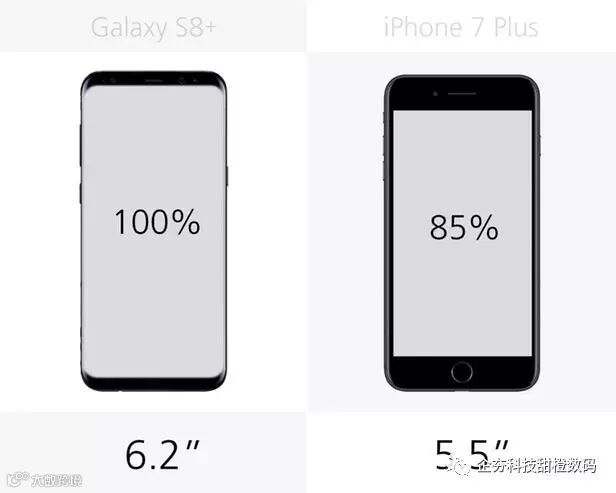 Galaxy S8+的屏幕尺寸要比iPhone 7 Plus大17%。这里需要再提醒的是设备的高度仅仅高了一点,而且还更窄、