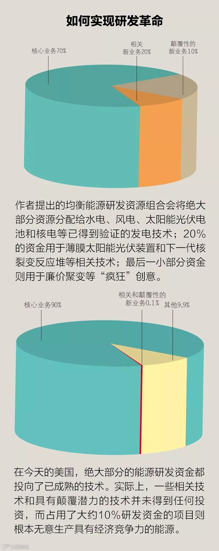 如果政府和能源公司在其技术研发投资方面也采用类似的方式,那岂不是很棒?其结果可能就像谷歌公司一样,以最快的速度实现能源创新。采用70-20-10规则将能够带来多种项目的投资组合。绝大部分的研发资源将投入现有的且行业了解该如何建立并有利部署的能源技术。这些技术可能根本无法使我们免遭气候变化,但却可以降低这一亟待解决的问题的难度。另外20%的研发资源可用于各类有望具备经济可行性的尖端技术。最为关键的是,最后10%的研发资源可以投向那些看似疯狂但却有可能产生深远影响的创意。我们的社会需要为科学家和工程人员提供充裕的资金,供他们不断提出和测试新的创意,虽有可能很快失败,但却可以分享他们的经验教训。当前的能源创新周期仍以数十年计,究其原因,在很大程度上是因为投入决定性研发工作的资金实在少得可怜。